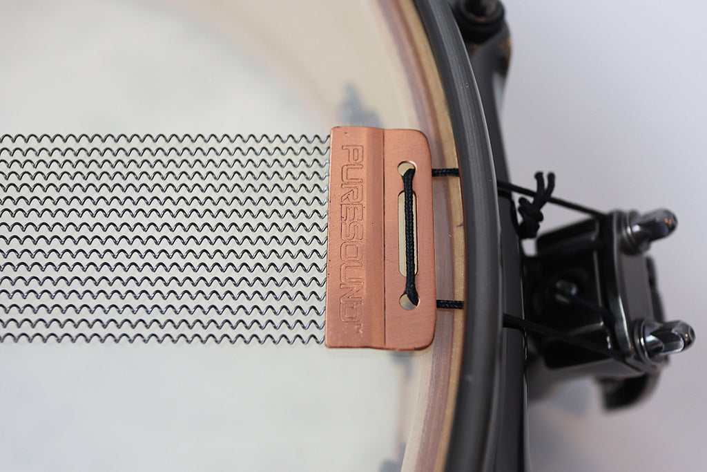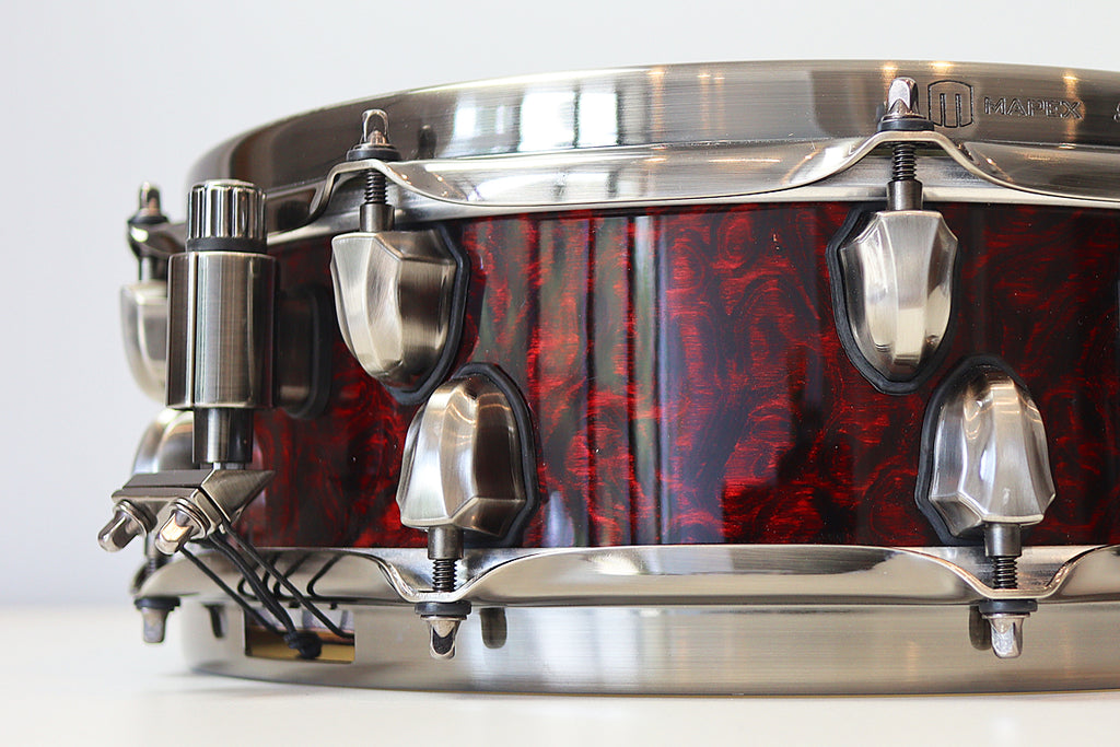 This is the original version of the Russ Miller Signature Snare. The shell is maple and mahogany, 4-5/8" (depth) x 14" (diameter), and just over 8mm thick. The batter side features a reinforcement ring and rounded 45 degree bearing edge, while the resonant side has no ring and a rounded 35 degree edge. The drum sports 20 offset lugs and the factory spec Remo Fiberskyn Diplomat top and Ambassador snare side heads and Puresound 16-strand wires.