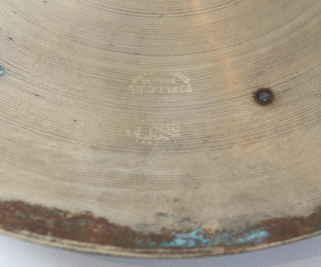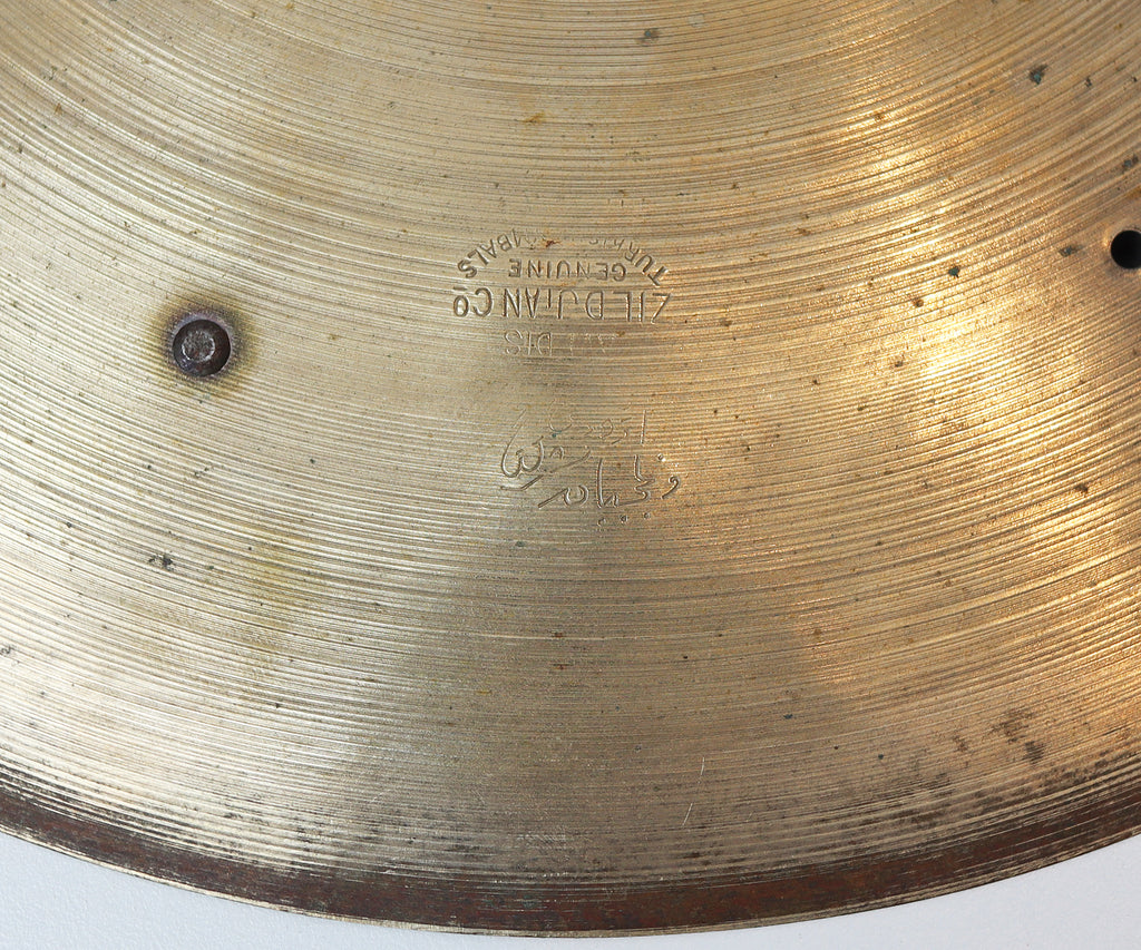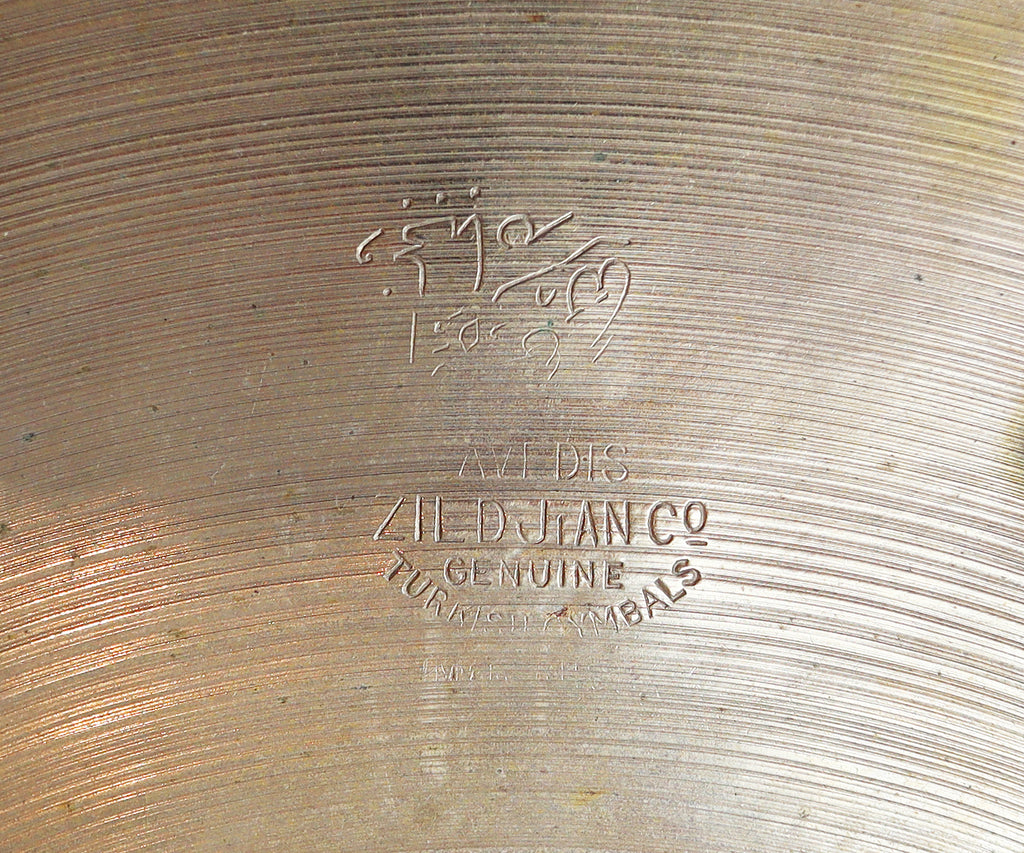 Based on the "pre-transition" (also called "first" or "second") stamp, this cymbal likely dates back to the 1930s or 1940s. Note that the Ottoman script is upside down relative to the English portion, confirming that Zildjian used two separate stamps in this era.